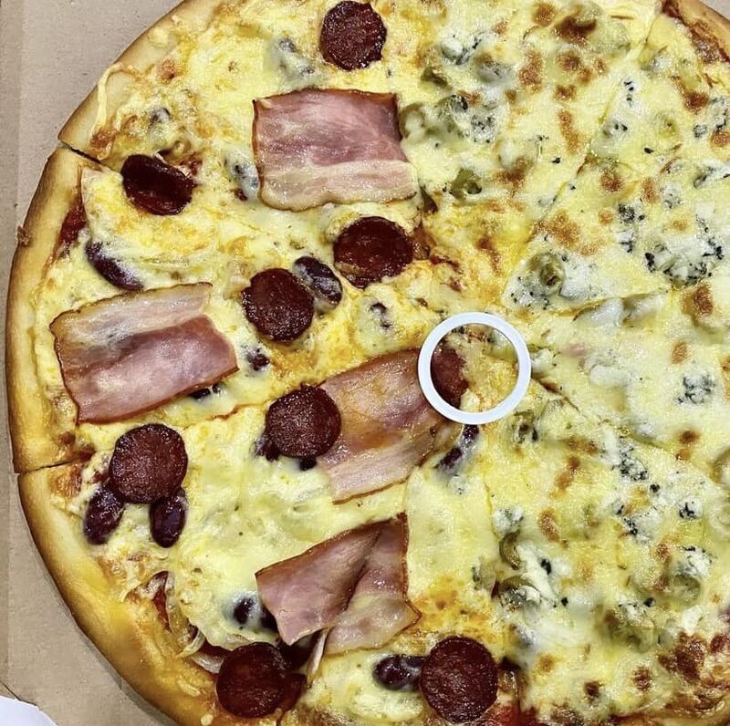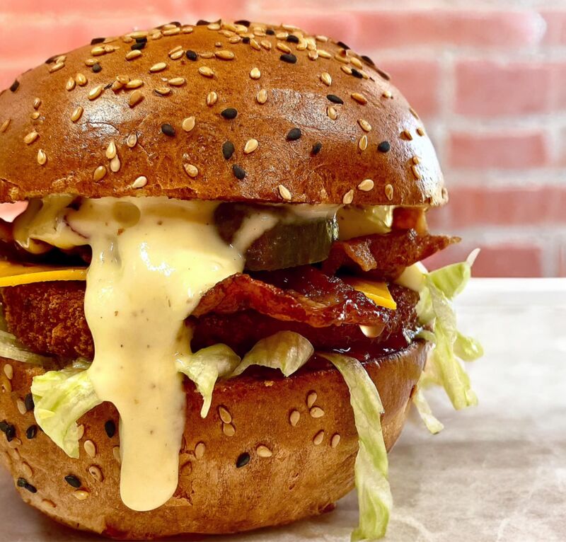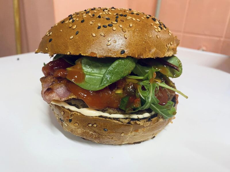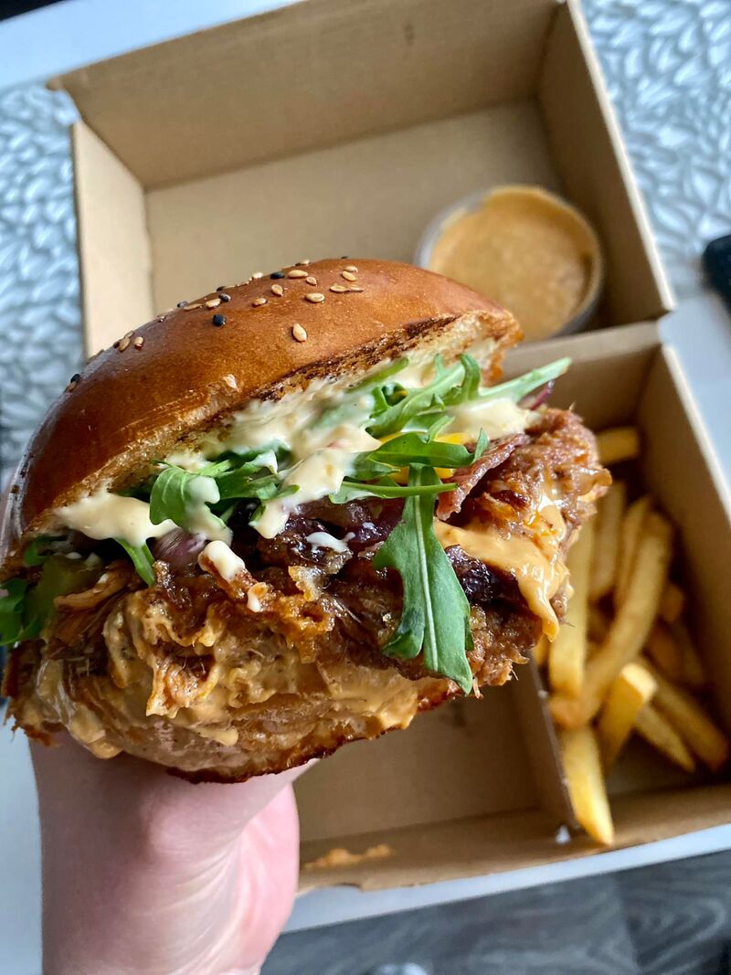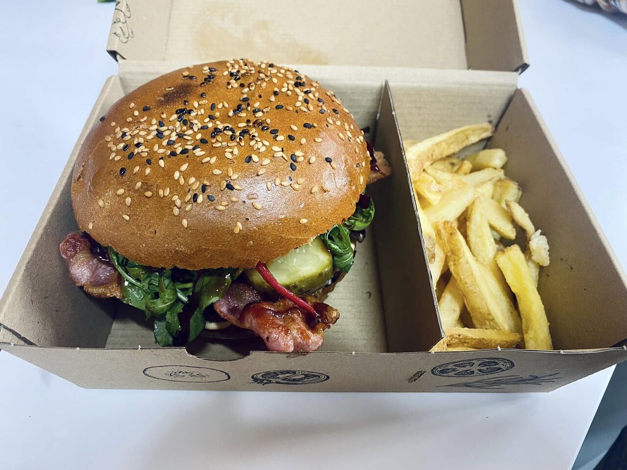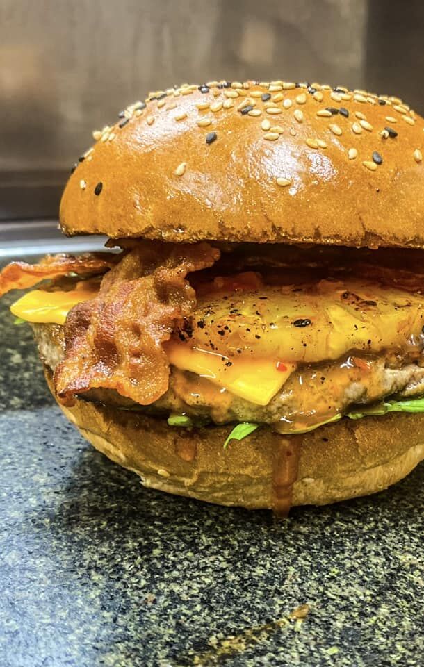 žemľa , mäso , slanina , sriracha omáčka ,cheddar v chrumkavom obale , kyslá uhorka , chic omáčka , cheddar plátok , karamelizovana cibuľa